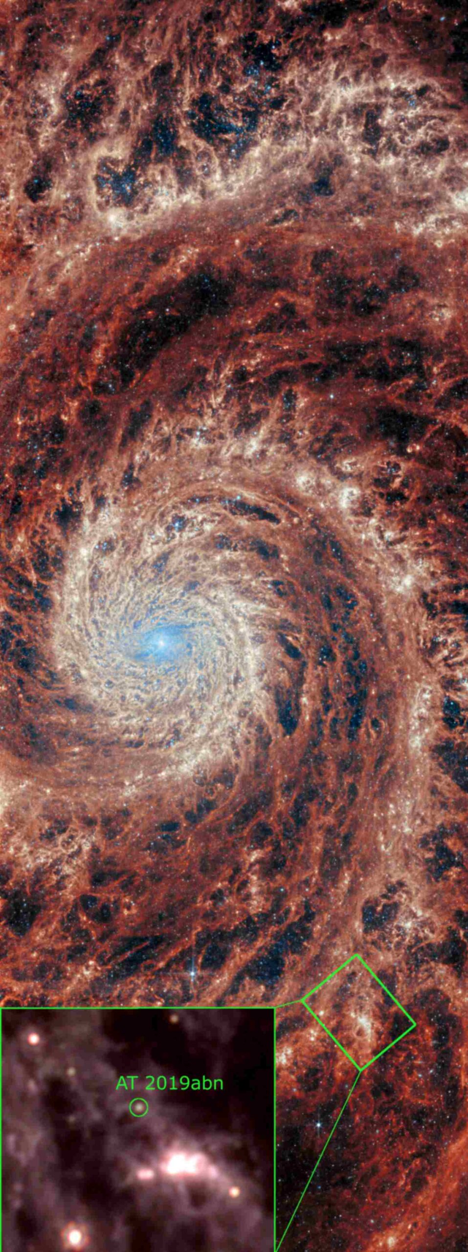 transienti rossi a luminosità intermedia sono con ogni probabilità delle vere esplosioni di stelle, e non delle semplici eruzioni. Immagine della Galassia Vortice (M51) ottenuta con il James Webb Space Telescope. In basso, nello zoom, viene evidenziata la posizione di AT 2019abn, uno dei transienti analizzati. Crediti: INAF/G. Valerin, A. Rigutti