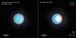 As seen in 2022, Uranus’s north pole shows a thickened photochemical haze that looks similar to the smog over cities. Several little storms can be seen near the edge of the polar haze boundary. Hubble has been tracking the size and brightness of the north polar cap and it continues to get brighter year after year. Astronomers are disentangling multiple effects – from atmospheric circulation, particle properties, and chemical processes — that control how the atmospheric polar cap changes with the seasons. At the Uranian equinox in 2007, neither pole was particularly bright. As the northern summer solstice approaches in 2028 the cap may grow brighter still, and will be aimed directly toward Earth, allowing good views of the rings and the north pole; the ring system will then appear face-on. This image was taken on 10 November 2022.