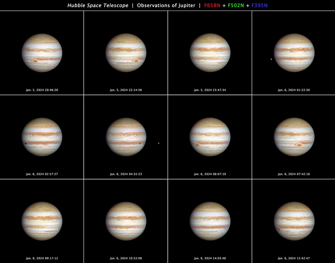 This 12-panel series of NASA/ESA Hubble Space Telescope images, taken on 5–6 January 2024, presents snapshots of a full rotation of the giant planet Jupiter. The Great Red Spot can be used to measure the planet’s real rotation rate of nearly 10 hours. The innermost Galilean satellite, Io, is seen in several frames, along with its shadow crossing over Jupiter’s cloud tops. Hubble monitors Jupiter and the other outer Solar System planets every year under the Outer Planet Atmospheres Legacy programme (OPAL).