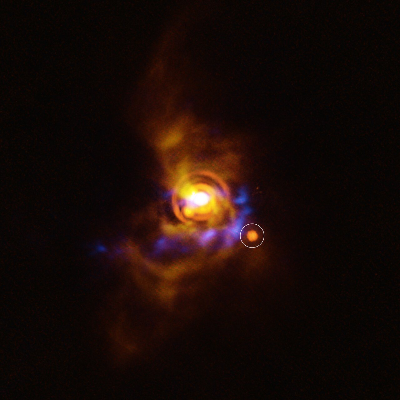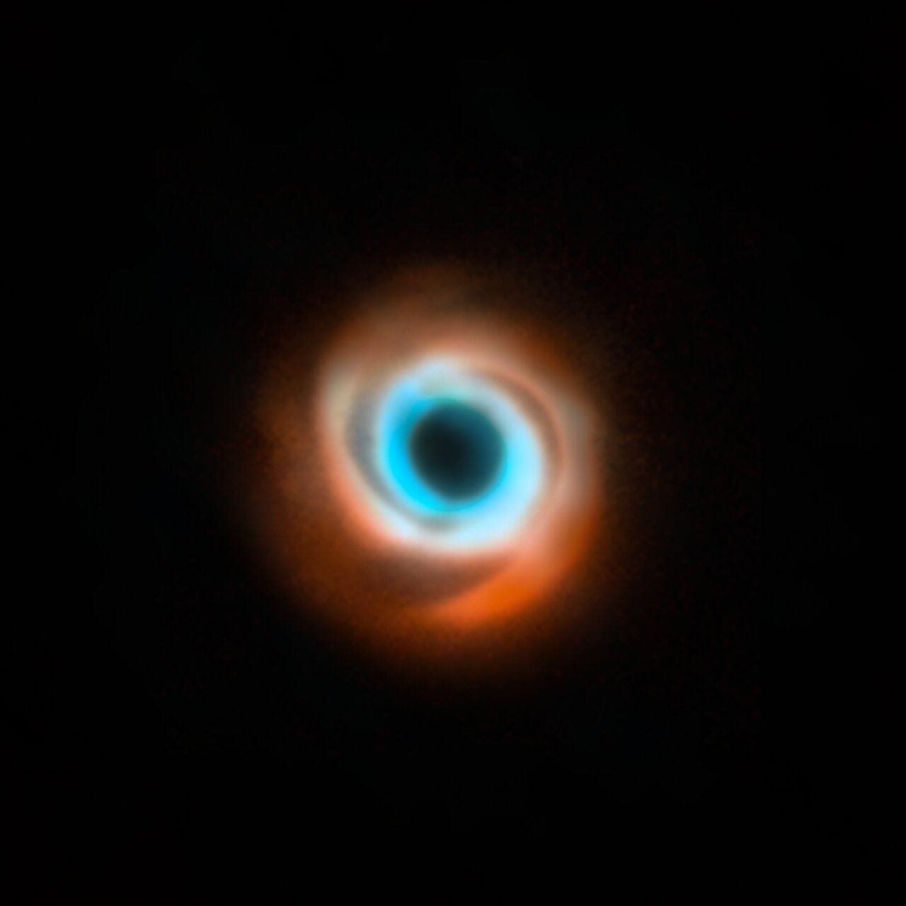 The image to the right is a combination of previous observations taken with the SPHERE instrument also at the VLT (red) and the Atacama Large Millimeter/submillimeter Array (ALMA, orange and blue). These and other previous studies of HD 135344B did not find signatures of a companion, but ERIS may have finally unveiled the culprit responsible for the star’s spiral disc.
