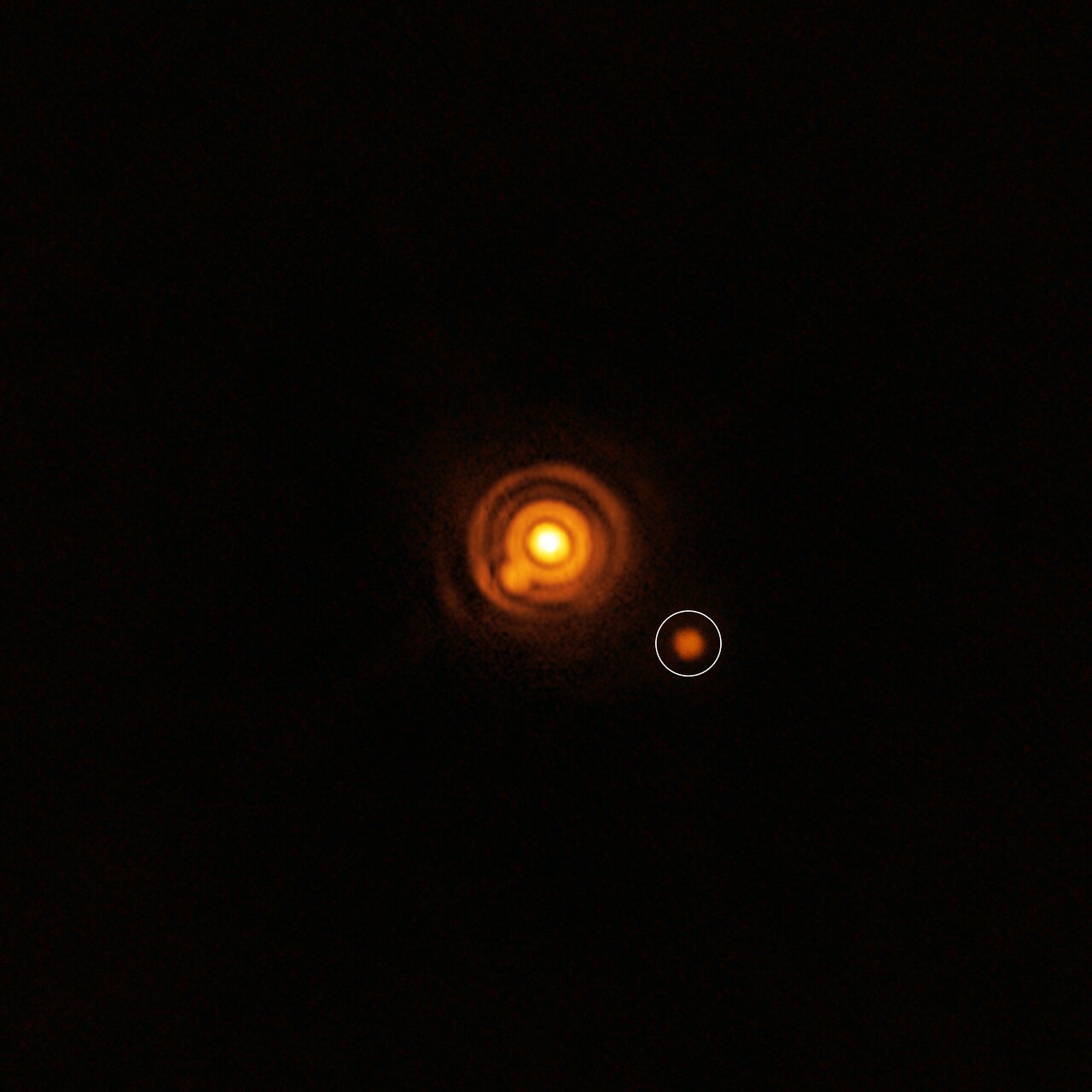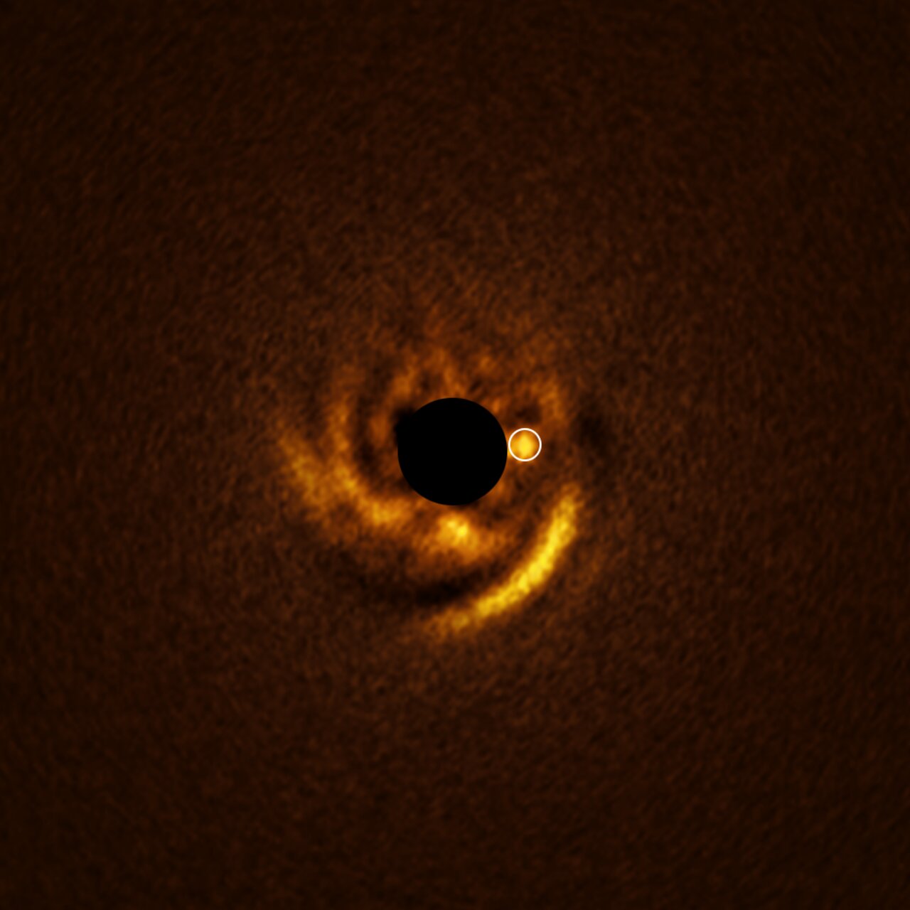 The image was captured with a new VLT instrument: the Enhanced Resolution Imager and Spectrograph (ERIS). The central black circle corresponds to a coronagraph –– a device that blocks the light of the star to reveal faint details around it. The white circle indicates the location of the planet.