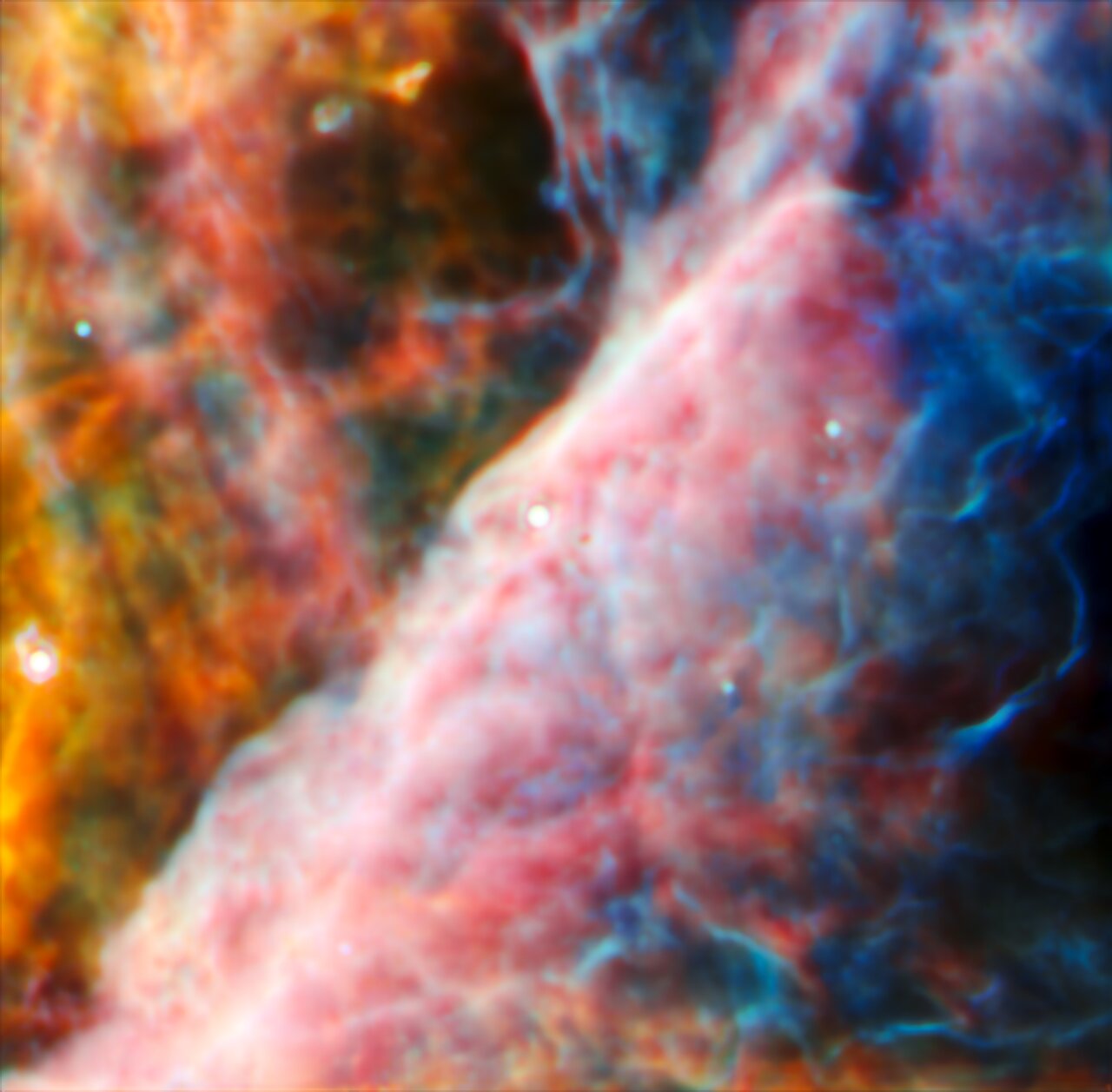 In this image, blue, green, and red were assigned to Webb’s NIRCam (Near-Infrared Camera) data at 0.9, 1.15, and 1.5 microns; 2.0, 2.77, and 3.55 microns; and 3.56, 4.1, and 4.44 microns (F090W, F115W, and F150W; F200W, F277W, and F335M; and F356W, F410M, and F444W), respectively.