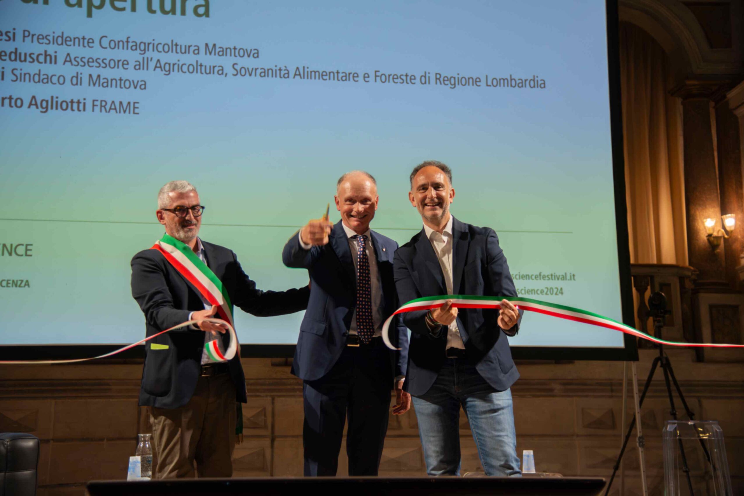 Come da tradizione, sul palco per i saluti di apertura e il taglio del nastro, presentati da Alberto Agliotti (FRAME-Divagazioni scientifiche). il presidente di Confagricoltura Mantova Alberto Cortesi, che ha espresso grande soddisfazione per la strada percorsa dalla manifestazione, ormai un punto di riferimento e un unicum in Italia, l’Assessore all’Agricoltura, alla Sovranità Alimentare e alle Foreste di Regione Lombardia Alessandro Beduschi, che in più occasioni ha raccontato di come il Food&Science Festival abbia dato un impulso al progresso e alle tecnologie in campo agricolo, proprio a partire dall’uso delle TEA (Tecniche di Evoluzione Assistita), e il Sindaco di Mantova, Mattia Palazzi, sostenitore del Festival fin dalla prima edizione, da sempre convinto del valore scientifico e culturale rivestito per la città e il territorio tutto.